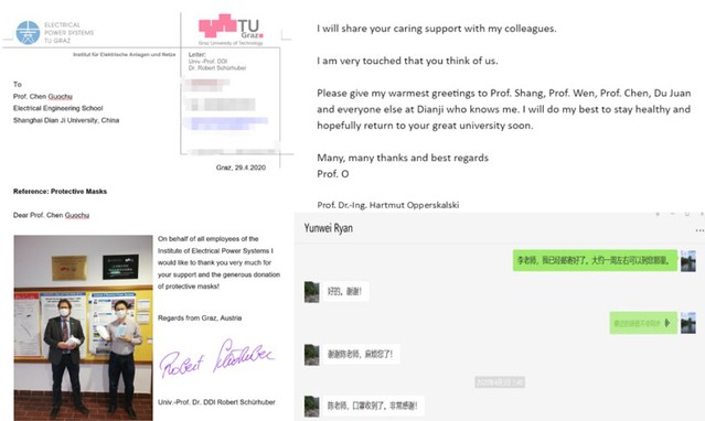 海外師生收到口罩等防疫物資后,紛紛表達對學校及學院的感激之情。海外名師奧地利格拉茨技術大學電力系統研究所所長Robert Schürhuber在感謝信中寫道:“我代表電力系統研究所全體員工,非常感謝你們的支持和慷慨捐贈的防護口罩!”海外名師凱撒斯勞滕應用技術大學Hartmut Opperskalski教授回信說:“我會和我的同事們分享你們的關心和支持,我很感動你們想到我們!”在美國、英國等國家的海外名師及訪學的老師們也對學校、學院的關心表達了由衷的感謝。在海外訪學交流的學生也說到:“非常感謝學校和學院送來的關懷,我們會照顧好自己,有信心打贏這場防疫戰。”