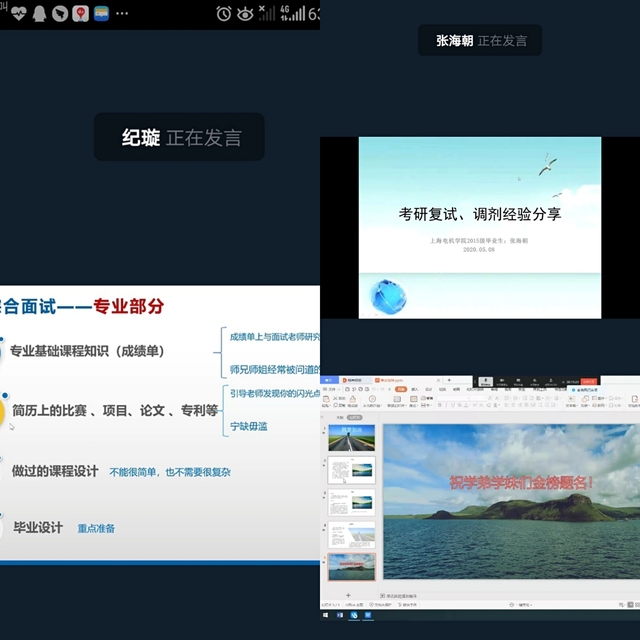 “一定要準備好中英文自我介紹,要像乘法口訣一樣流利背出來”“面試的時候要虛心接受老師的指點”“今年許多學校為視頻復試,一定要提前調試好設備,可以提前找人模擬多做練習,保證語速適中,舉止得當”“調劑的學生一定要注意調劑系統開放的時間盡快填好提交,千萬不要錯過黃金時間段”“專業知識的準備尤其要注意專業基礎課程知識、做過的課程設計、簡歷上的比賽、項目、論文、專利和畢業設計等”……一條條親身經歷過的經驗分享、一句句溫暖的提醒與鼓勵,老師和同學們分別從學校招錄研究生考察的注意事項和自身參加復試和調劑經歷的角度圍繞復試前的準備、復試中的注意事項、是否選擇調劑、如何進行調劑等內容各有側重地進行細致講解和經驗分享。文傳博詳細的介紹了今年復試形式的變化和調劑時的注意事項等。陳國初最后分析了今年考研的特殊形勢并發表了自己關于是否選擇調劑的一些看法,鼓勵同學們要在疫情期間保持平和心態,增強自信,認真準備迎接復試。