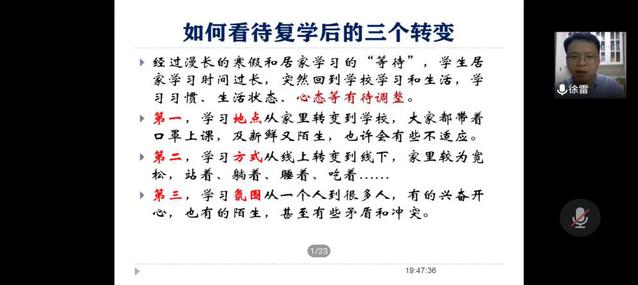 回歸校園,用心復學。如何看待復學后的三個轉變,徐老師分別從地點、方式、氛圍三個方面,就轉變為我們做了詳細的講解。面對突然的變化,需要心態的調整,良好的心態是成功復學開展的前提。同時,徐老師分享了在教育部華中師范大學心理援助熱線平臺進行心理援助的故事。告訴同學們往往心靈上的創傷要比生理上的來得更加痛苦且難以愈合,因此我們需要時刻重視心理健康問題。要求院心理協會、班級心理委員、宿舍心理觀察員,繼續保持線上聯系、發現問題及時上報。希望同學們疫情期間堅持健康打卡,養成良好的自律習慣,積極開展線上交往、尋求支持、及時消除不良情緒;保持良好的心態,微笑面對生活,提高心理免疫力。