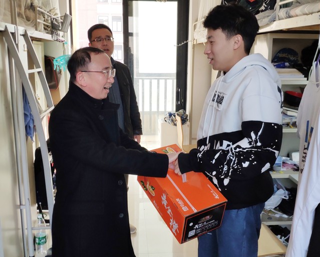 “假期在學校的生活學習都正常吧?”“家鄉疫情目前已經穩定了吧?”“好久沒理發了吧,看上去沒以前精神了嘛,抽空快去理理發。”一句句家長里短的問候,一聲聲真情流露的囑托,讓留校的同學們感受到了來自學校的關愛。27日下午,電氣學院院長陳國初,副書記、副院長卿海龍前往學生宿舍看望寒假留校學生,了解同學們的學習生活情況,并為他們送上暖心禮盒。