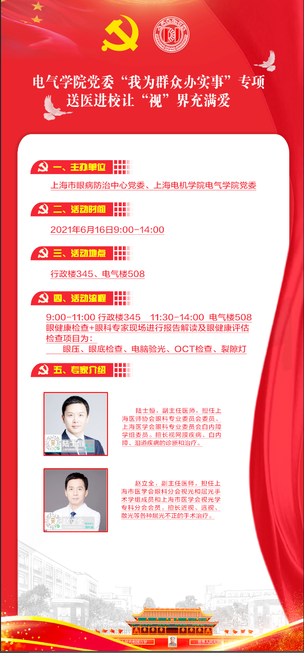 為進一步貫徹黨史學習教育工作要求,推進落實“我為群眾辦實事”工程,鞏固和豐富醫校黨建共建成果,上海市眼病防治中心黨委和上海電機學院電氣學院黨委在前期共建成果的基礎上,共同商議決定聯合開展“我為群眾辦實事”送醫進校專項活動。通過眼健康檢查、專家報告解讀與眼健康評估等服務將眼健康知識、理念送到人們身邊,呼吁更多人關注眼健康,并且愿意參與其中,持續推動眼健康事業發展,讓“視”界充滿愛。具體活動方案如下: