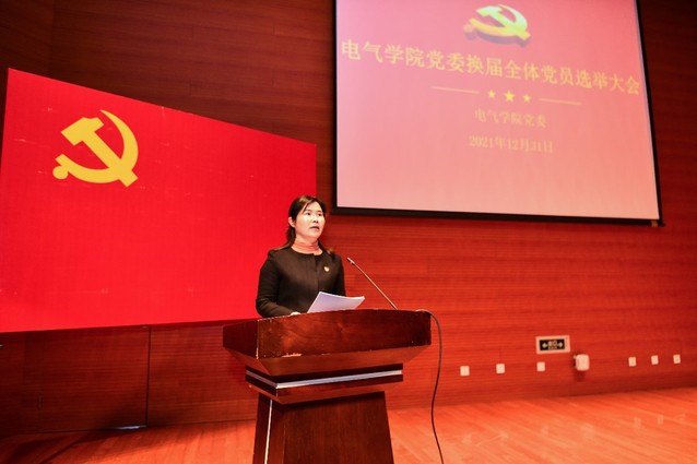 學校常委、黨委組織部部長代表學校做最后的總結講話。她首先對新當選的黨委委員表示熱烈的祝賀!她指出,電氣學院黨委的換屆選舉工作具有特殊重要的意義,2021年是建黨100周年,馬上進入的2022年是黨的二十大即將召開的一年,是學校十四五規劃的開局之年。換屆選舉作為黨的政治生活中最基本、最基礎的工作之一,電氣學院黨委的各項工作扎實規范,進展有序,充分發揚了黨內民主,體現了公平、公正、公開的原則。同時代表學校黨委提出了三點希望與要求:一是要堅持學習,積極建設學習型、服務型、創新型黨組織。要以黨的創新理論滋養初心、引領使命,推動習近平新時代中國特色社會主義思想往實里走、往心里走、往深里走,將學習貫穿始終,聚焦工作實際,做到理論聯系實際。不斷增強四個意識、堅定四個自信、做到兩個維護。二是要堅持密切聯系群眾,切實發揮黨組織的戰斗堡壘作用。學校基層黨組織是黨密切聯系廣大師生員工的橋梁和紐帶。廣大師生是從基層組織的工作和周圍黨員的表現來認識我們黨、評價我們黨。在新的歷史條件下,必須充分發揮黨密切聯系群眾的優勢,始終與人民心連心、同呼吸、共命運,不斷加強黨的自身建設,確保黨的各項任務才能落到實處。三是堅持創先爭優,無私奉獻,做好學校發展的“排頭兵”。黨員是黨的基層組織的細胞,是黨的生命力與戰斗力的基礎,黨組織的政治引領作用和戰斗堡壘作用是通過每個黨員的先鋒表率作用體現出來的,學校馬上跨入“十四五”建設的新征程,機遇和挑戰并存,動力與壓力同在。希望每個黨員率先垂范、帶動一片,團結一心、攻堅克難,為創造更加美好燦爛的明天不斷奮斗!