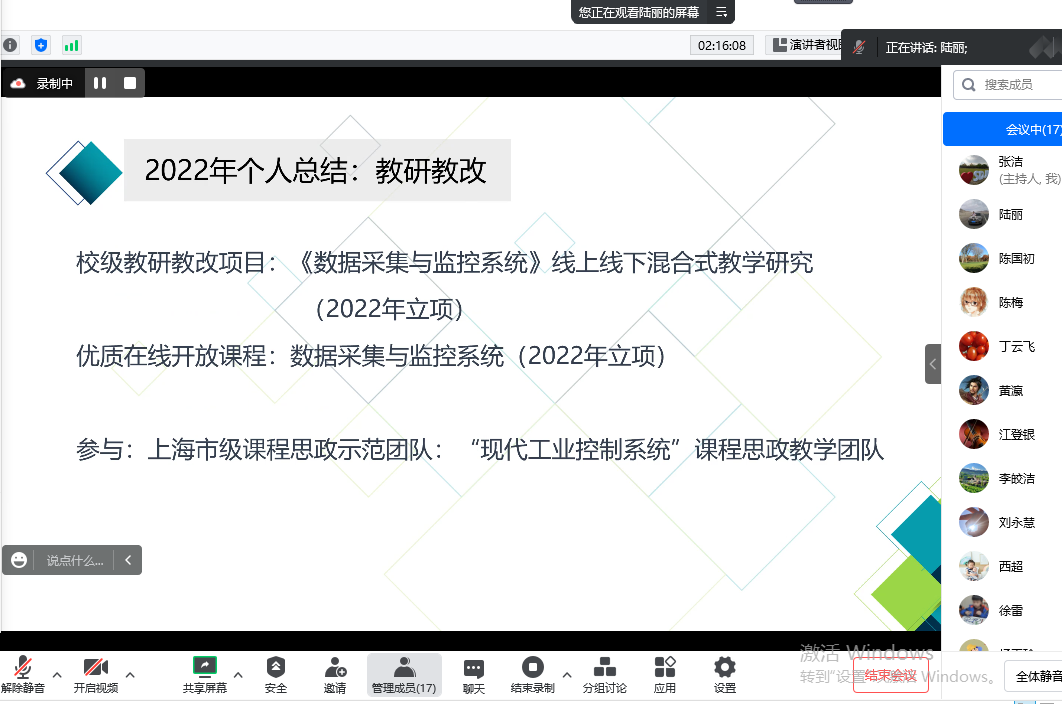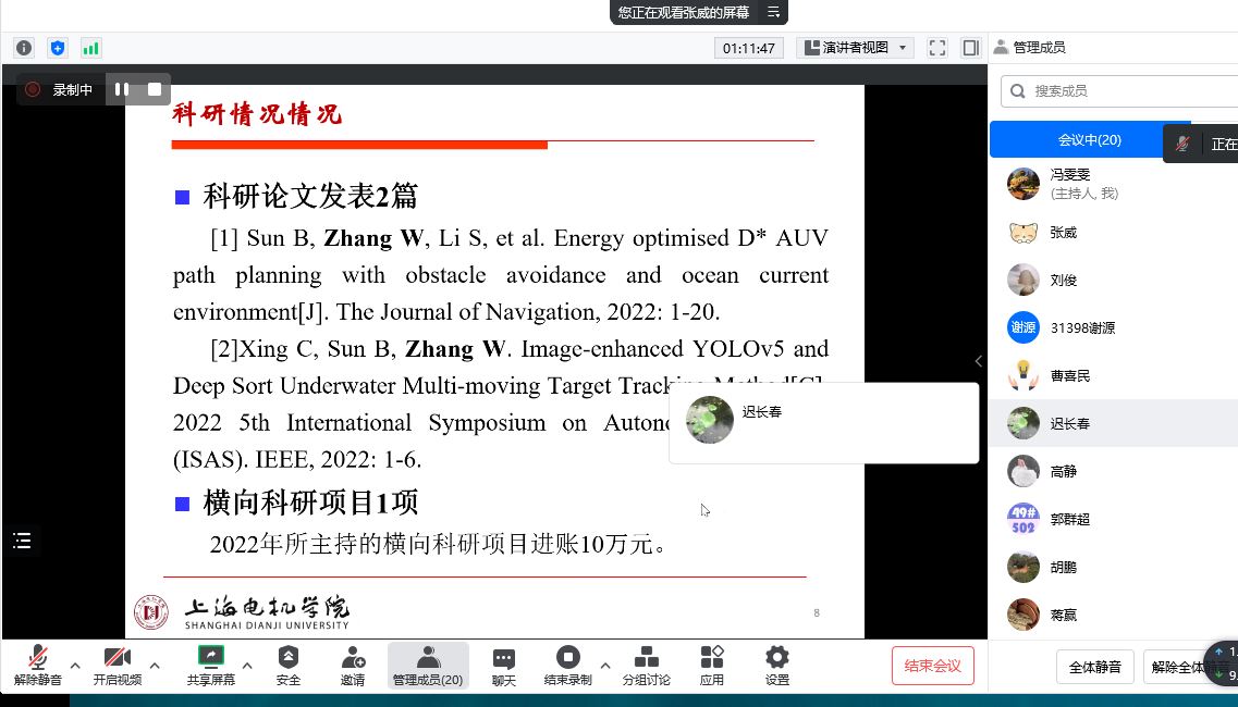 “本年度我承擔的《電力系統暫態分析》獲校級線上線下混合式一流課程建設項目,發表科研論文兩篇,主持橫向科研項目1項,科創項目立項1項,指導研究生參加2022年“中國光谷·華為杯” 第十九屆中國研究生數學建模競賽,獲全國三等獎。明年我將進一步聚焦我的研究方向,積極申報科研項目,加快我的科研步伐,為提升人才培養質量積蓄更多的動力源泉。”遠在加拿大訪學的電氣系博士教師張威在年度述職交流會上客觀地總結自己本年度成績和展望2023年計劃。