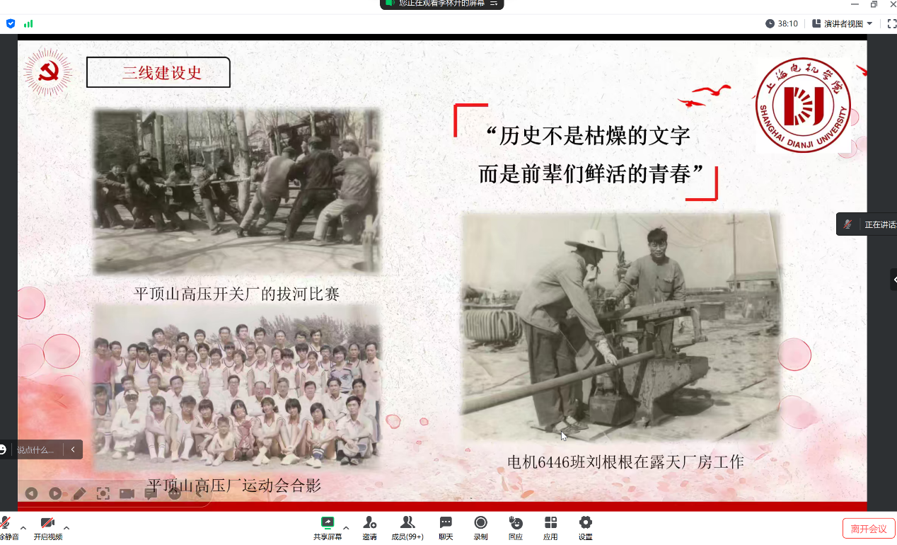 接著,與會者共同觀看“尋訪校友足跡、點亮中國制造”尋訪團精心制作的尋訪視頻——《尋訪共和國三線建設者 重溫新中國工業發展壯闊征程》,生動地展示了尋訪團自715日從上海出發,歷時24天,總行程三萬里,“特種兵式”跨越西北、西南、東北、華北、華中11省市,尋訪到36名校史上的三線建設者,實地考察或探訪了17家從上世紀三線建設時期建立、成長起來的裝備制造企業的寶貴歷程。”這次尋訪是讓我真實地進一步深入了解了厚重的校史、三線建設史,用行走的腳步切身體悟到中西部的工業發展史和社會主義發展史……這是一堂全周期紅色的基因體悟課”,參加尋訪的電氣2114的劉圣典同學懷著敬重的心情線下分享尋訪過程中的所思所感,真摯地表達對三線精神建設者的崇敬之情。尋訪團成員胡心依同學在線上通過視頻剪影講述了她所見到的三線精神建設者的故事,回顧三線建設歷史,為那個充滿困難和挑戰的年代感到由衷地敬佩;尋訪團成員王修羽同學通過尋訪中的三個關鍵詞——成長、責任與使命,講述他的感悟,“這次尋訪是一次搶救式尋訪,要爭分奪秒的將這段輝煌的歷史收集保留下來,再傳承下去,講好三線故事,讓更多人從中獲得那一年代的精神財富”。