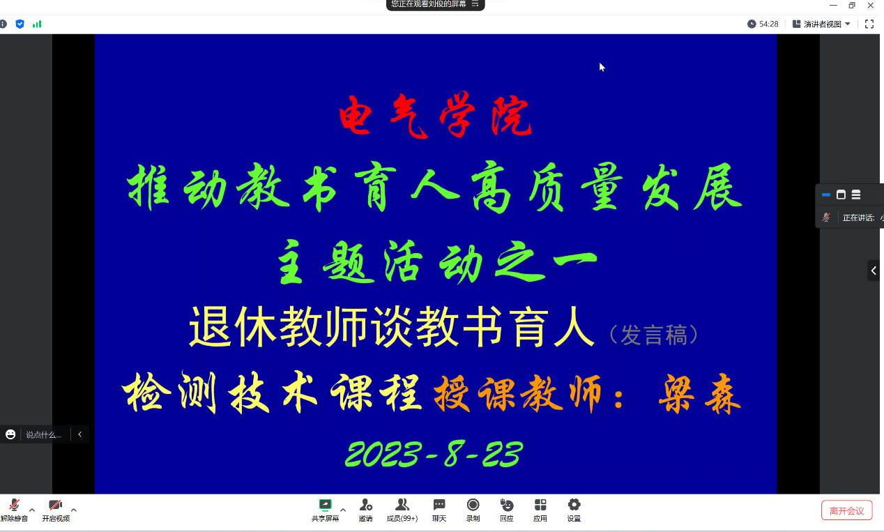 最后,電氣學院黨委書記劉俊對本次活動作總結講話。她代表學院師生對此次兩位老師精心準備的交流發言表示衷心感謝,兩位老師是學校自強不息、追求卓越精神的真實寫照,也是落實學校技術立校、應用為本辦學方略的生動實踐,是親身實踐課程思政的老前輩,是積極推進產教融合的典范,他們的言傳身教是青年教師們教書育人的楷模,希望學院師生積極發揚三線建設精神,主動將校史、三線建設史融入到課程思政中,融入到教學實踐中,學習兩位老師的教書育人精神,用身邊人講身邊事,用身邊事教育感染新一代的大學生,以實際行動推進教育教學的高質量發展。要求在審核評估工作中,充分發揮基層黨組織戰斗堡壘和黨員先鋒模范作用,凝聚評估力量,推動主題教育見行見效。教師黨員對標本科教育教學審核評估要求,加強教風、師德師風建設,不斷提高業務能力和教育教學質量。學生黨員要了解本科教育教學審核評估工作的意義、要求及相關安排,展示良好學風、規范文明行為,當好迎評促建的“排頭兵”,爭當迎評促建的“宣傳員”。