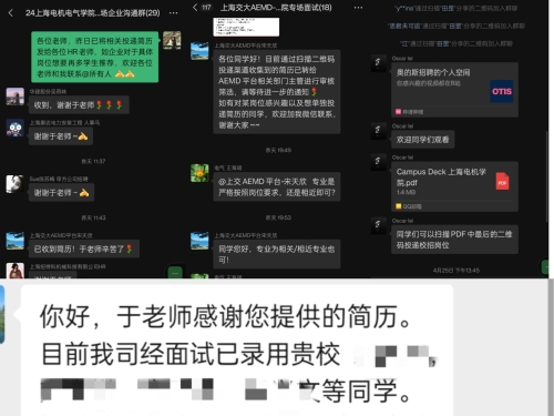 招聘會上,上海交大AEMD平臺、奧的斯電梯管理(上海)有限公司、上海華建電力設備股份有限公司、上海同盛電力有限公司、凱思勒傳動技術(上海)有限公司、上海太易檢測技術有限公司、上海北羽自動化科技有限公司、富奧汽車零部件股份有限公司、特來電新能源股份有限公司、上海賀通人力資源管理(集團)有限公司、上海新華控制技術集團科技有限公司、上海紐特科機械科技有限公司、上海中車艾森迪海洋裝備有限公司、上海康達電力安裝工程有限公司等通過PPT宣講、播放宣傳片等方式向同學們介紹了企業概念,招聘崗位職責要求、工作地點、薪資及福利待遇等。為便于企業與學生更好地交流,電氣學院為每家參加宣講企業專門建立了微信面試群。