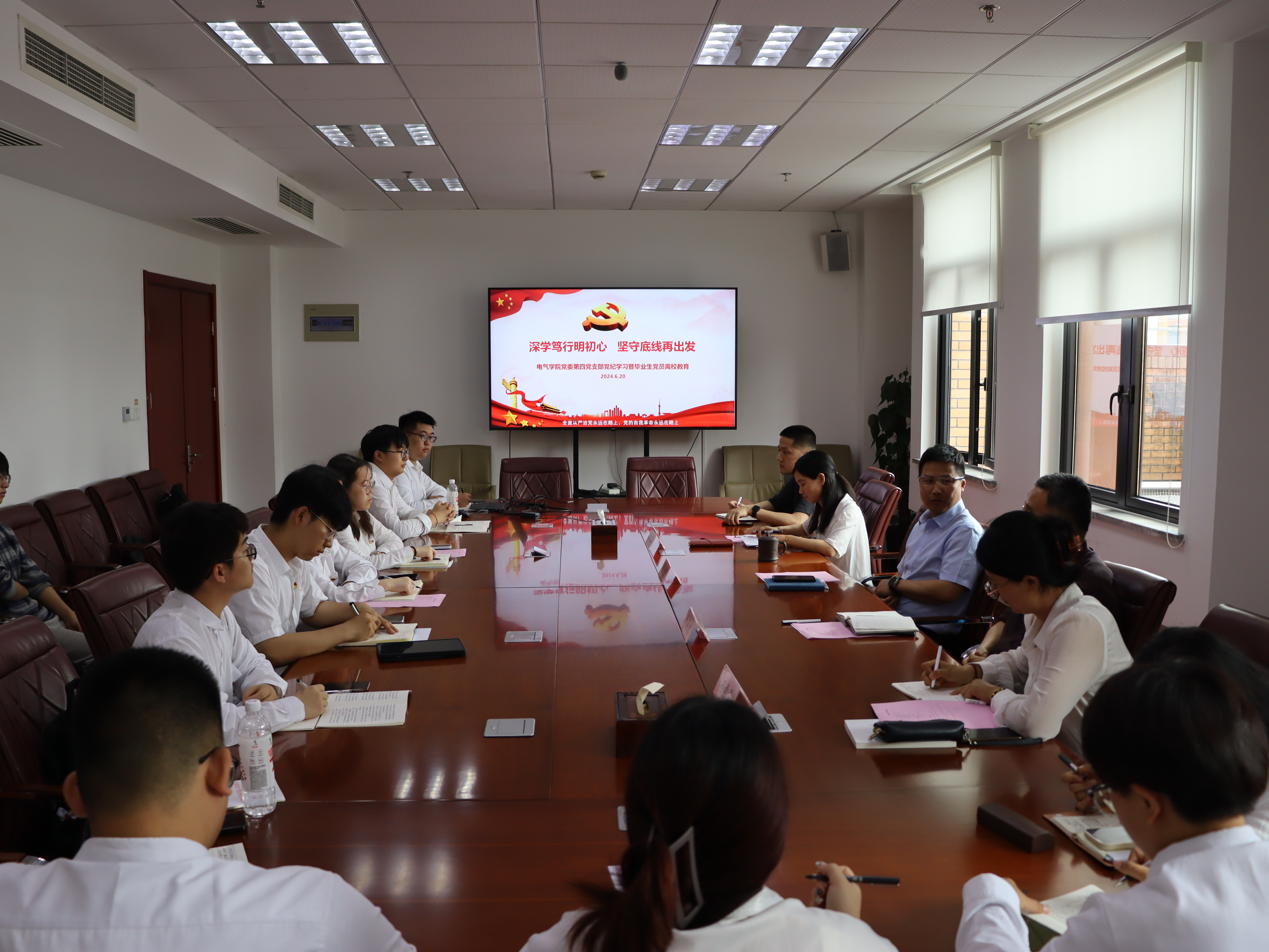 6月20日,電氣學院第四黨支部在行政樓316會議室開展“深學篤行明初心 堅守底線再出發”黨紀學習教育暨畢業生黨員離校教育。聯系該支部的學校委副書記、副院長朱洪春蒞臨指導,學院黨委副書記副院長卿海龍、專職組織員馮雯雯列席參加。