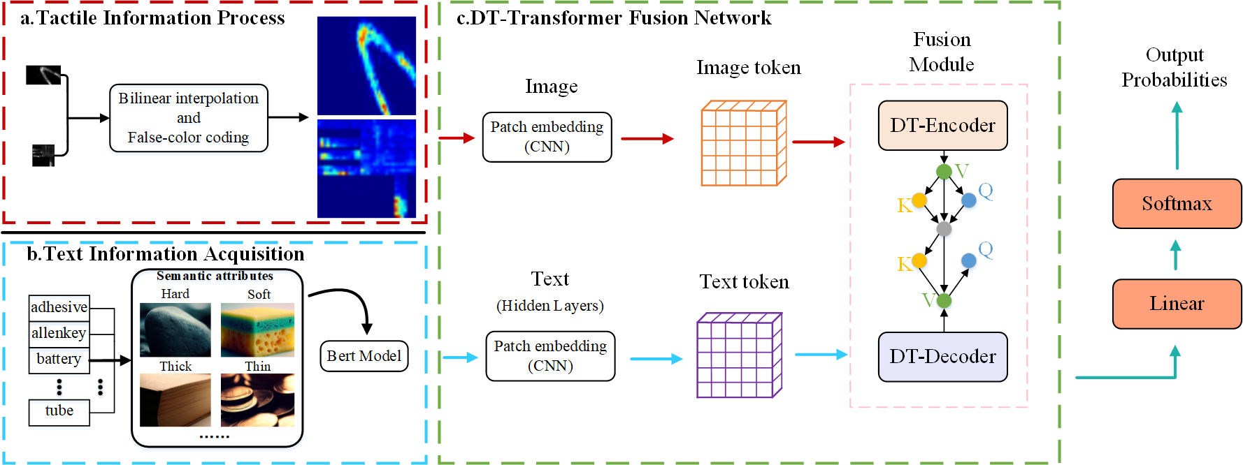 對此,研究團隊提出DT-Transformer網絡:一個從觸覺和文本數據中學習的新框架。通過多頭關注機制實現了一種基于Transformer網絡的專門融合機制,以解決這些不同信息類型融合的挑戰。相關研究成果以“DT-Transformer: A Text-Tactile Fusion Network for Object Recognition”為題,發表在觸覺領域知名期刊《IEEE Transactions on Haptics》(IF 2.4,中國科學院三區)上。該研究成果以上海電機學院為第一單位,在讀碩士生邱圣杰為第一作者,李保江老師為通訊作者。