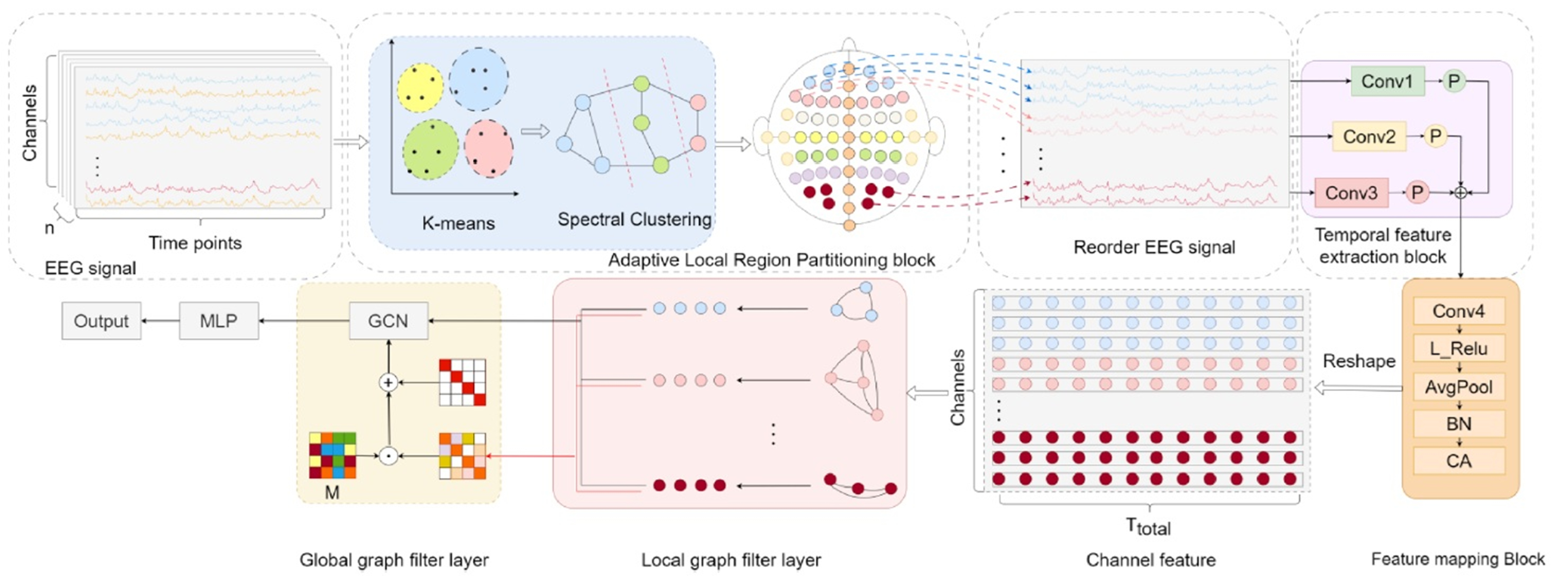 ALGGNet網絡由三個基本組件組成:自適應局部區域劃分塊、時間學習塊和圖學習塊。首先采用神經科學中的腦功能區概念,并采用雙聚類算法自適應地為特定數據集生成類腦功能區。然后根據聚類結果對EEG通道進行重新排序。隨后,EEG信號通過時間信息處理階段和圖學習階段。時間信息處理階段主要包括多尺度時間卷積塊和具有坐標注意力機制的特征映射塊。圖學習階段包括聚集關于局部區域的信息的圖過濾器和學習局部區域之間復雜關系的全局圖卷積網絡。該網絡適用于腦機接口應用,包括運動圖像腦電圖信號的解碼和情緒識別。
