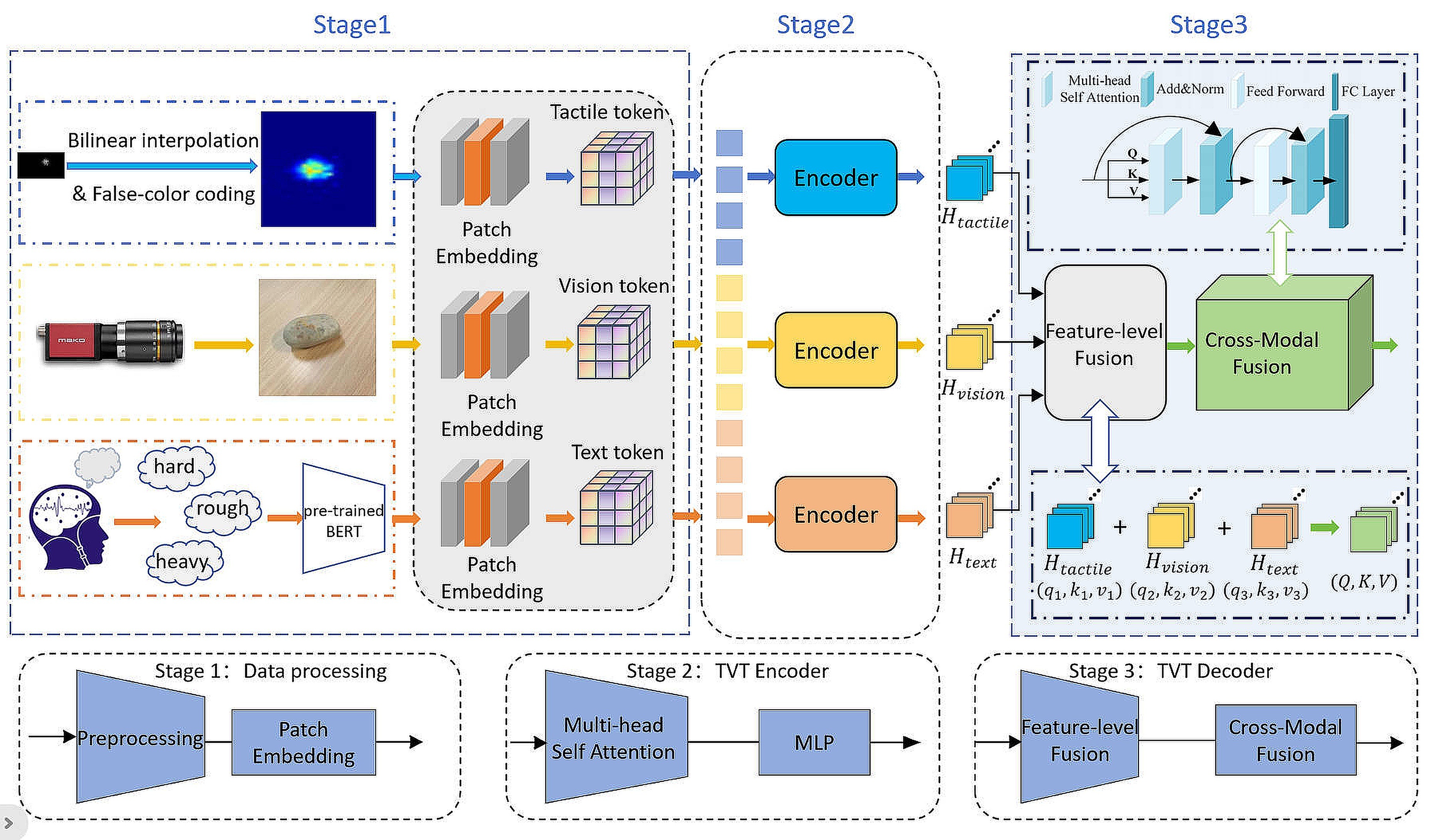針對這一問題,研究團隊提出了TVT-Transformer(Tactile-Visual-Textual:觸覺-視覺-文本),這是一個新的框架,用于從觸覺、視覺和語義文本三種模態數據中聯合學習。該方法利用注意力機制深入挖掘和對齊來自不同感知模態的信息,使模型能夠有效地整合觸覺、視覺和語義文本數據的特征,通過跨模態交互實現更深層次的信息融合。相關研究成果以“TVT-Transformer: A Tactile-Visual-Textual Fusion Network for Object Recognition”為題,發表在人工智能領域知名期刊《Information Fusion》(IF 14.8,中國科學院一區,Top期刊)上。