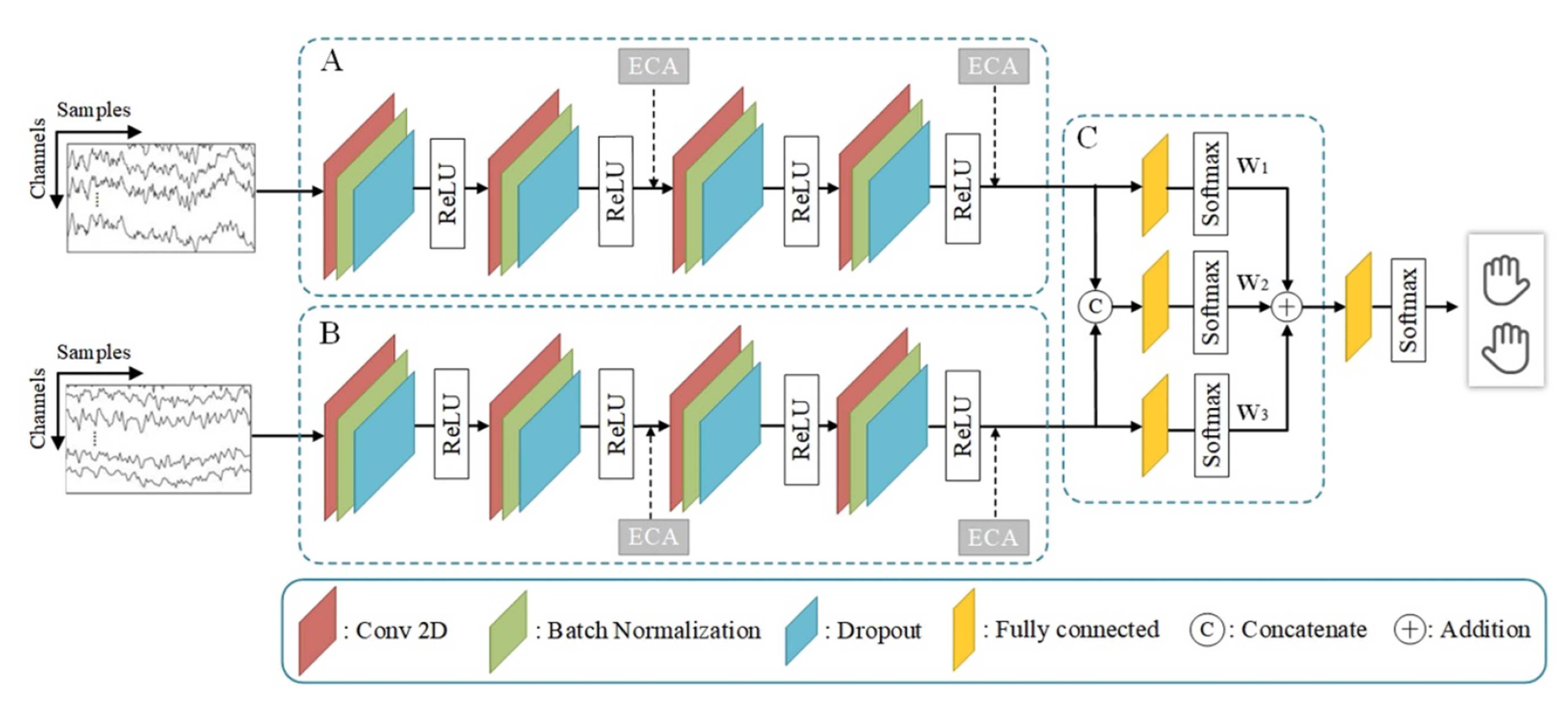 為了解決單模態信號分類和多模態信號融合分類的性能不佳的問題,研究團隊提出了一種混合EEG-fNIRS信號的ECA-FusionNet分類網絡。相關研究成果以“ECA-FusionNet: A hybrid EEG-fNIRS signals network for MI classification”為題,發表在工程技術領域知名期刊《Journal of Neural Engineering》(IF 3.7,中國科學院三區)上。