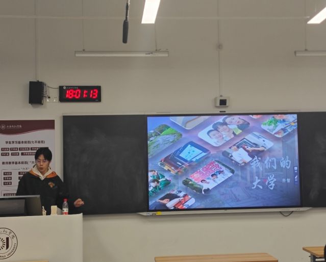齊智站在講臺上,目光溫和而堅定,圍繞大學生活主題分享了他的成長歷程。他談到,在大學期間應勇于追尋理想、探索未知,盡管過程中可能會遇到挑戰與平淡,但每一段經歷都是寶貴的成長財富。齊智雖在多方面表現優異,但他也坦誠分享了自己曾面臨的英語學習挑戰。面對困難,他并未退縮,而是充分發揮自身優勢,通過不懈努力獲得了老師的認可。在他的講述中,同學們深刻感受到大學生活的多元與充實,對大學生活的意義有了更清晰的認識。