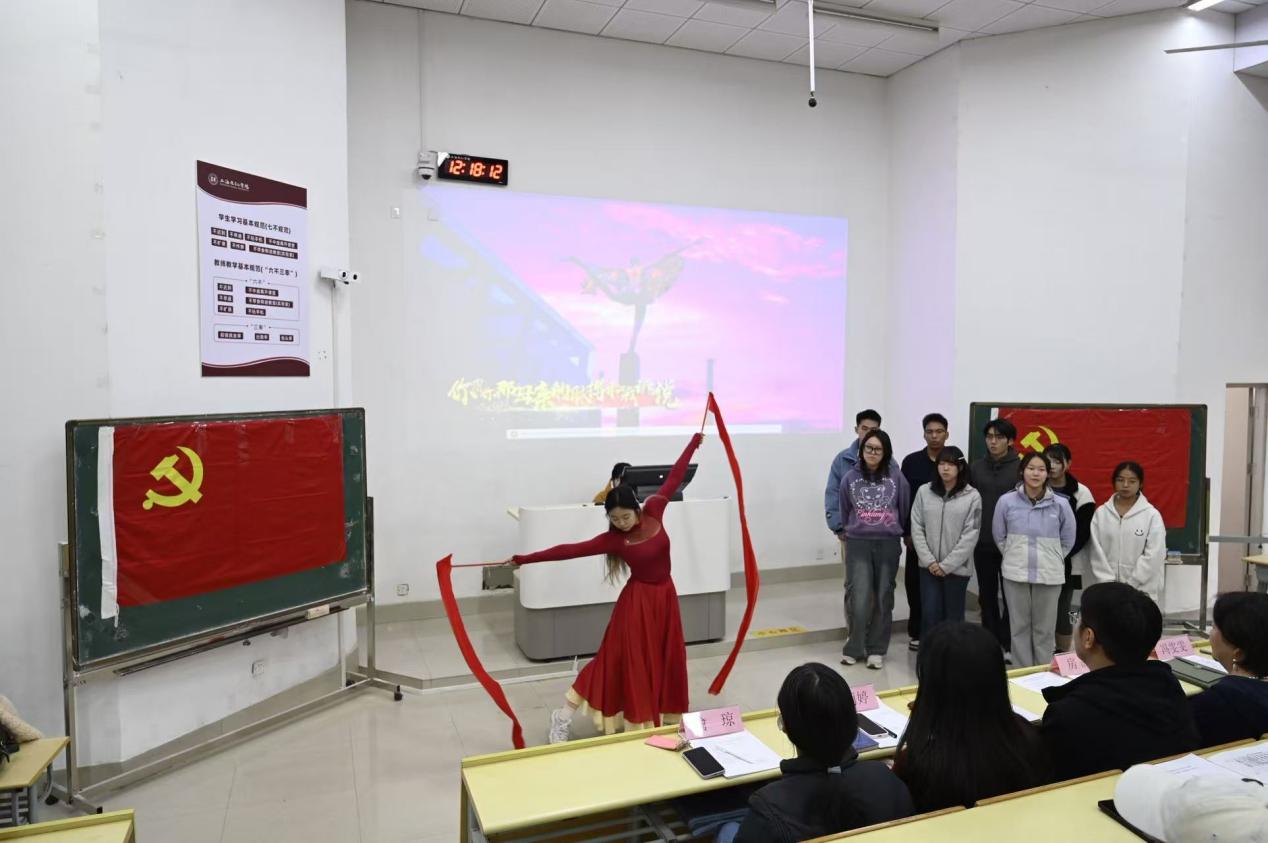 緊接著,本科生第三小組的表演閃亮登場。伴隨著熟悉的前奏響起,小組成員們面帶笑容、精神抖擻地站定,一首《我和我的祖國》緩緩唱響。清澈而真摯的歌聲瞬間感染了全場,不少觀眾都跟著旋律輕輕哼唱。尤為吸睛的是,隊伍前方一位身著鮮艷紅裙子的女生,手中揮舞著飄逸的紅絲帶,伴著悠揚的歌聲翩翩起舞。她的舞姿輕盈靈動,紅絲帶在半空劃出優美的弧線,時而如火焰般熱烈舒展,時而如波浪般輕柔起伏,與歌曲中對祖國的深情贊頌完美契合。成員們的歌聲愈發嘹亮,從最初的輕柔訴說逐漸轉為激昂高歌,紅裙女生的舞蹈也隨之變得更加奔放有力,將對祖國的熱愛與身為入黨積極分子的自豪,都融入到每一個動作與每一句旋律中。當最后一個音符落下,全場掌聲雷動,不少人眼中都泛起了感動的淚光,現場洋溢著濃厚的愛國情懷與集體榮譽感。