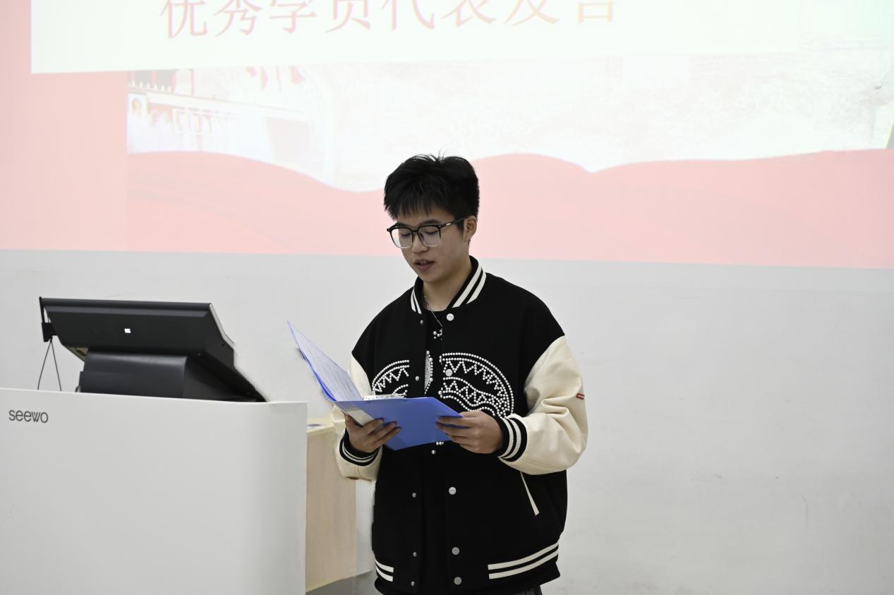 優秀學員代表、新能源2411班唐開新隨后登臺發言,他眼神明亮而真誠。他首先回顧了自己參訓的初心:“成為入黨積極分子的那一刻起,我就暗下決心,要抓住每一次學習機會,補足理論短板、錘煉黨性修養。”接著,他分享了自己在培訓中的收獲與成長,他深情地講到,這是培訓通過對黨的基本理論學習筑牢了信仰的根基;各項紅色實踐活動是深刻的紅色洗禮,給予了充足的精神養分,在小組討論中暢所欲言,既有理性的剖析,也有真誠的自我反思,思想的火花在碰撞中閃耀。在那些走出課堂的生動志愿服務活動中體悟奉獻的快樂與價值,在紅色教育基地參觀中,一張張圖片、一件件實物,無聲地訴說著“祖國需要就是最高命令”的火熱年代,更是觸摸到了紅色的精神脊梁。這些沉浸式的體驗,讓教科書上的文字變成了可感可知的精神血脈,讓理想信念變得無比具體而鮮活。最后,他代表全體優秀學員作出承諾:“結業不是學習的終點,而是新的起點。我們將以此次培訓為契機,繼續深耕理論學習、積極投身實踐,始終以黨員標準嚴格要求自己,用青春和汗水為學院發展、為國家建設添磚加瓦!”